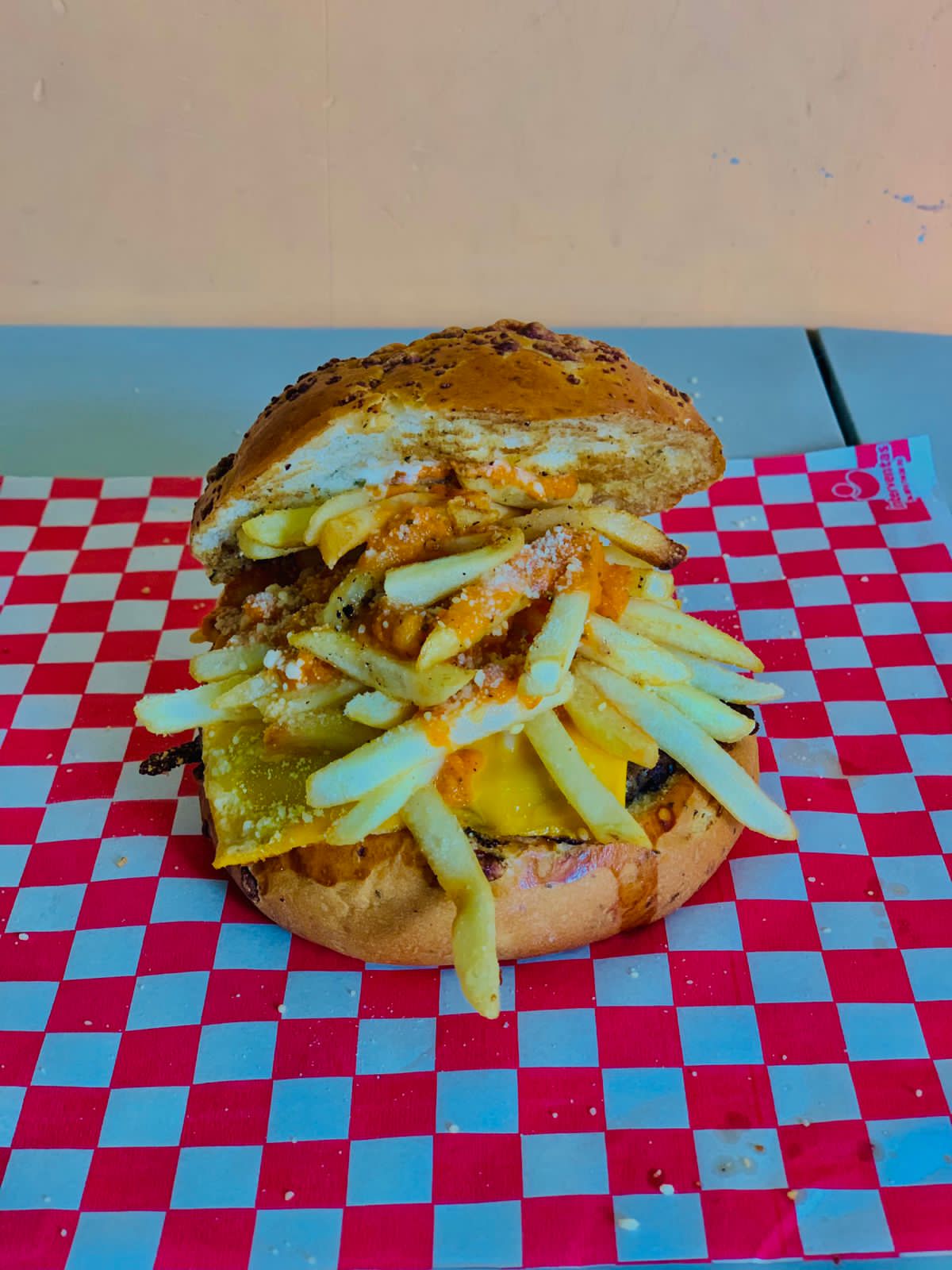 Carne de res gratinada bañada con queso amarillo, tocino y finas papas fritas.