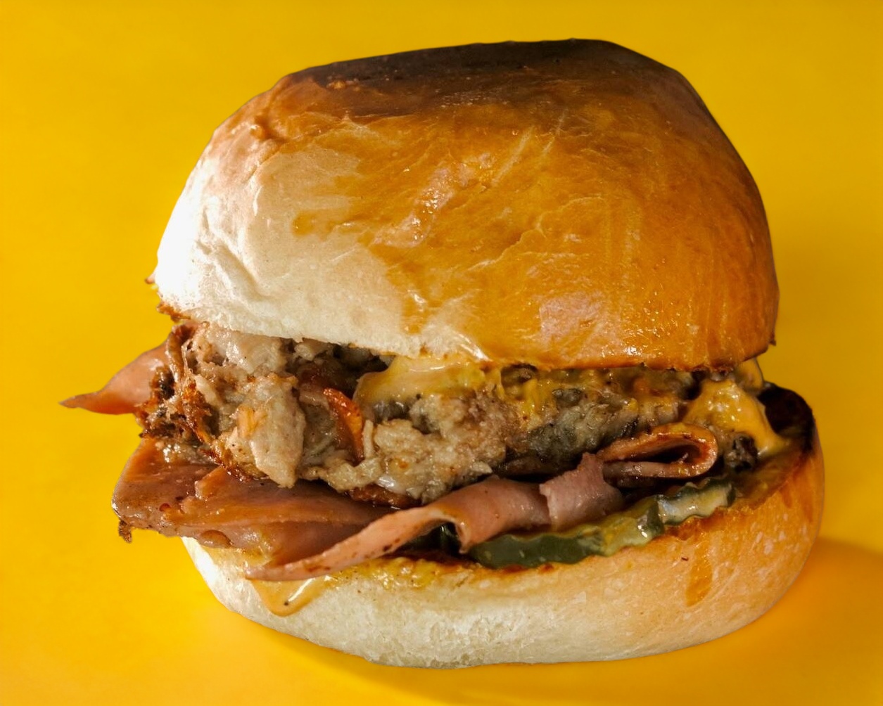 Sandwich en pan brioche con pierna de cerdo, queso americano y gouda, jamón, pepinillos, aderezo, cebolla morada encurtida y mostaza.