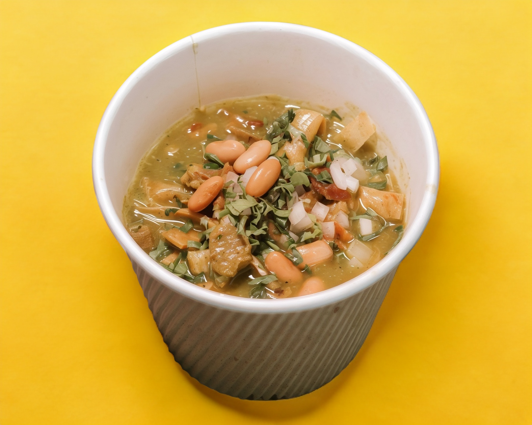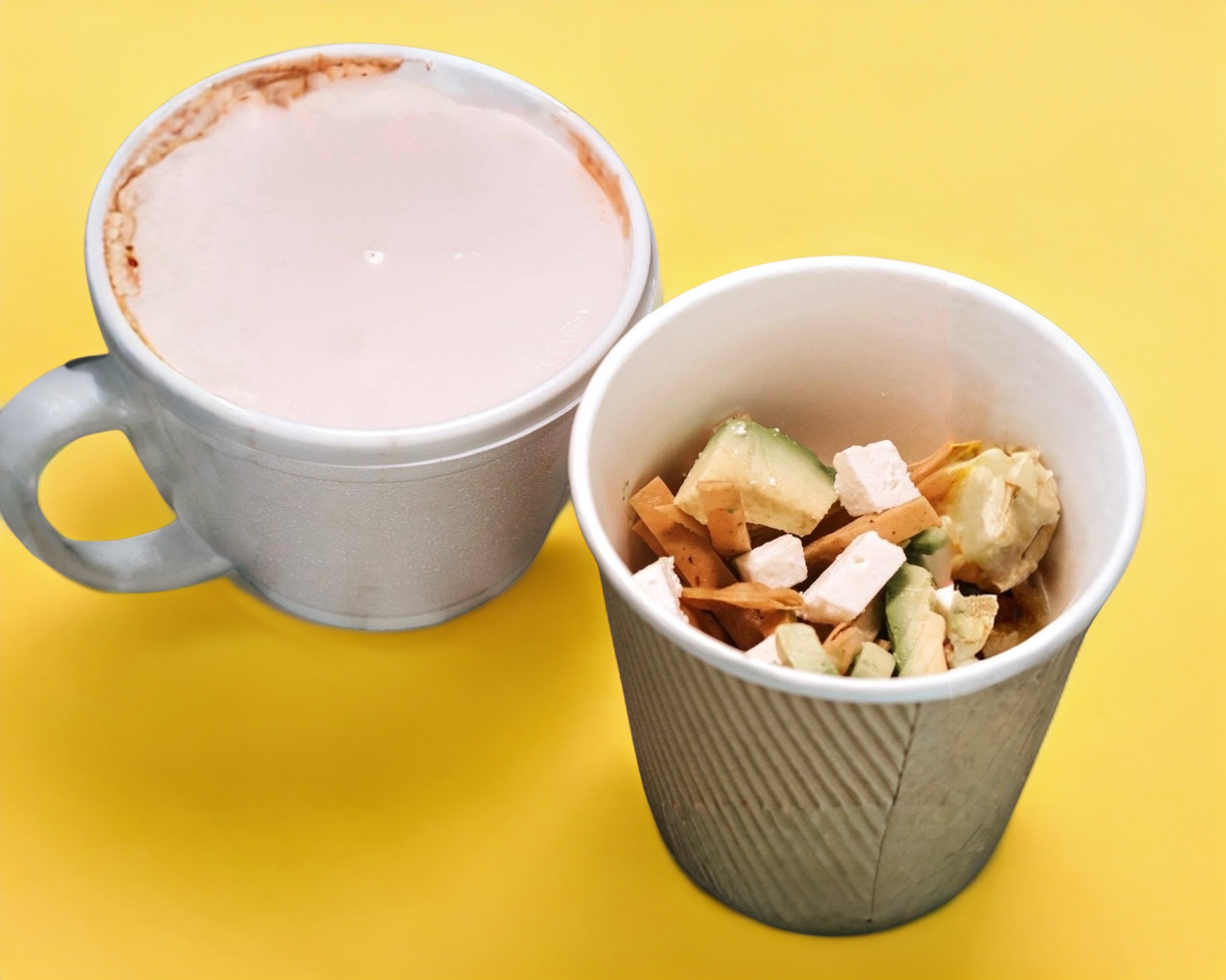 Sopa de pimiento, frijoles de la olla, champiñones, aguacate y queso panela acompañada de pan brioche con mantequilla
