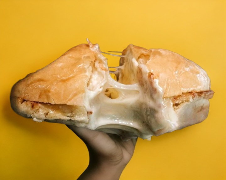 Sandwich en pan brioche de la casa con queso americano, gouda, monterey jack y aderezo