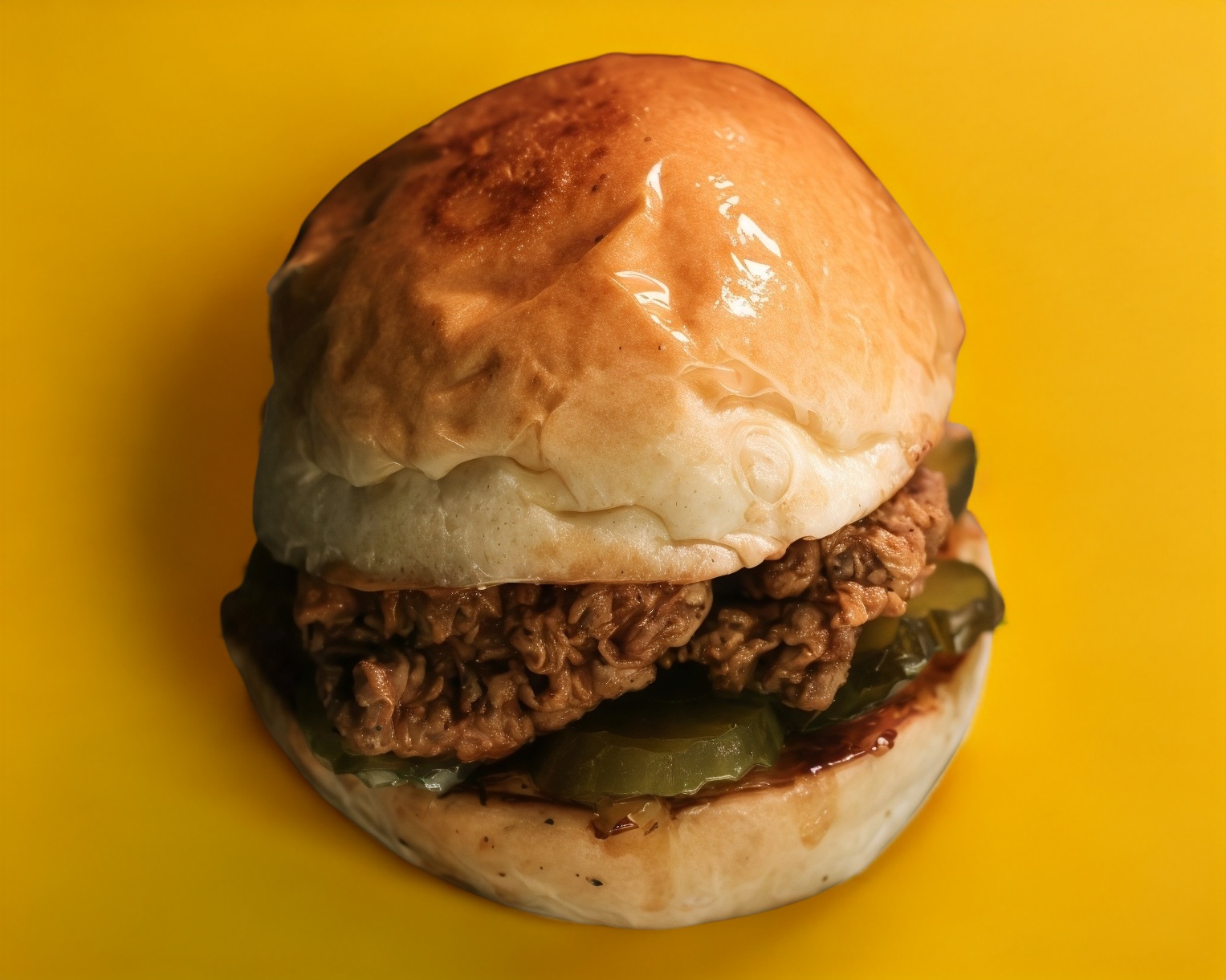 Sandwich de pechuga de pollo frita con aderezo de la casa y pepinillos
