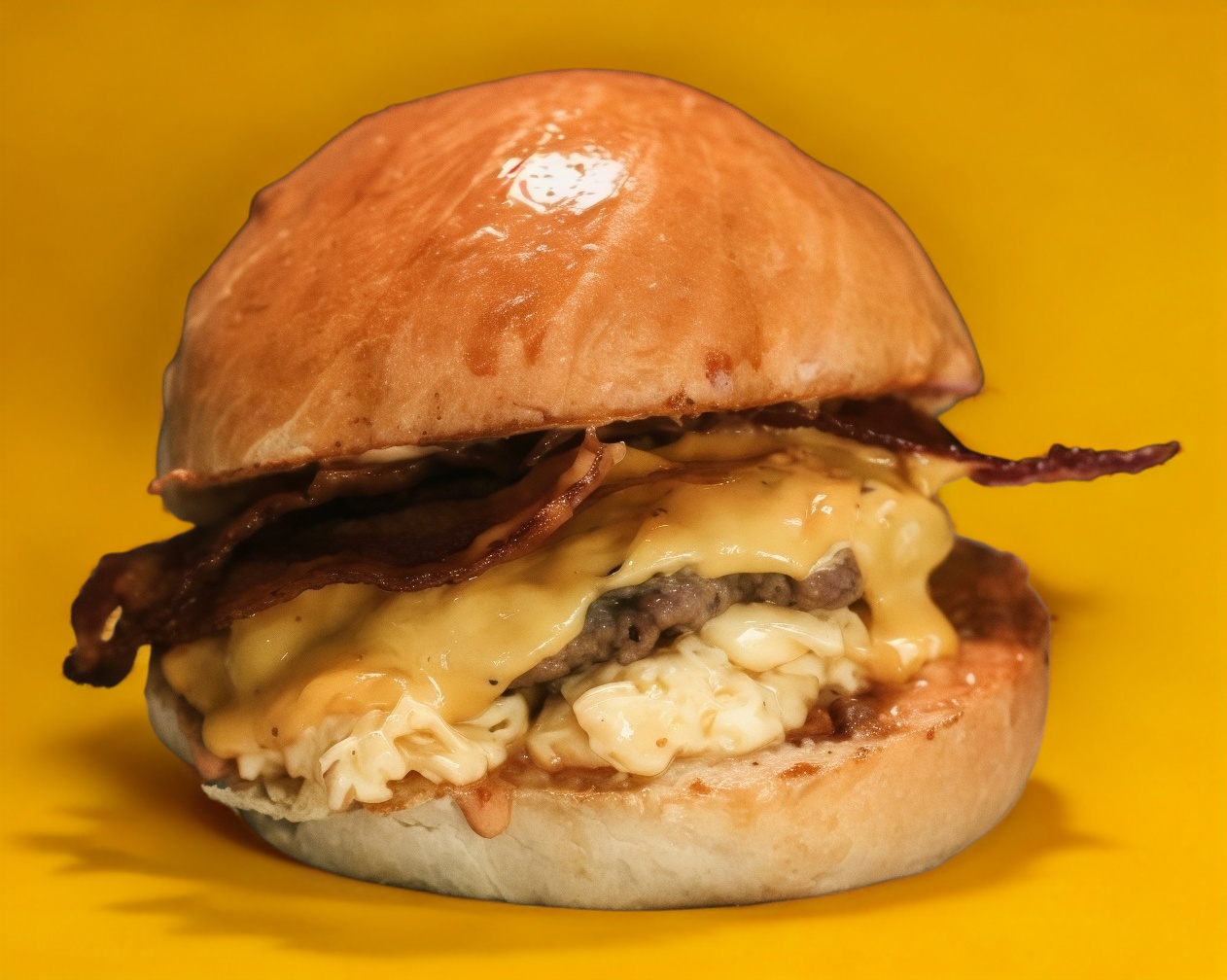 Hamburguesa con carne, un huevo estrellado o revuelto, tocino, queso americano y aderezo
