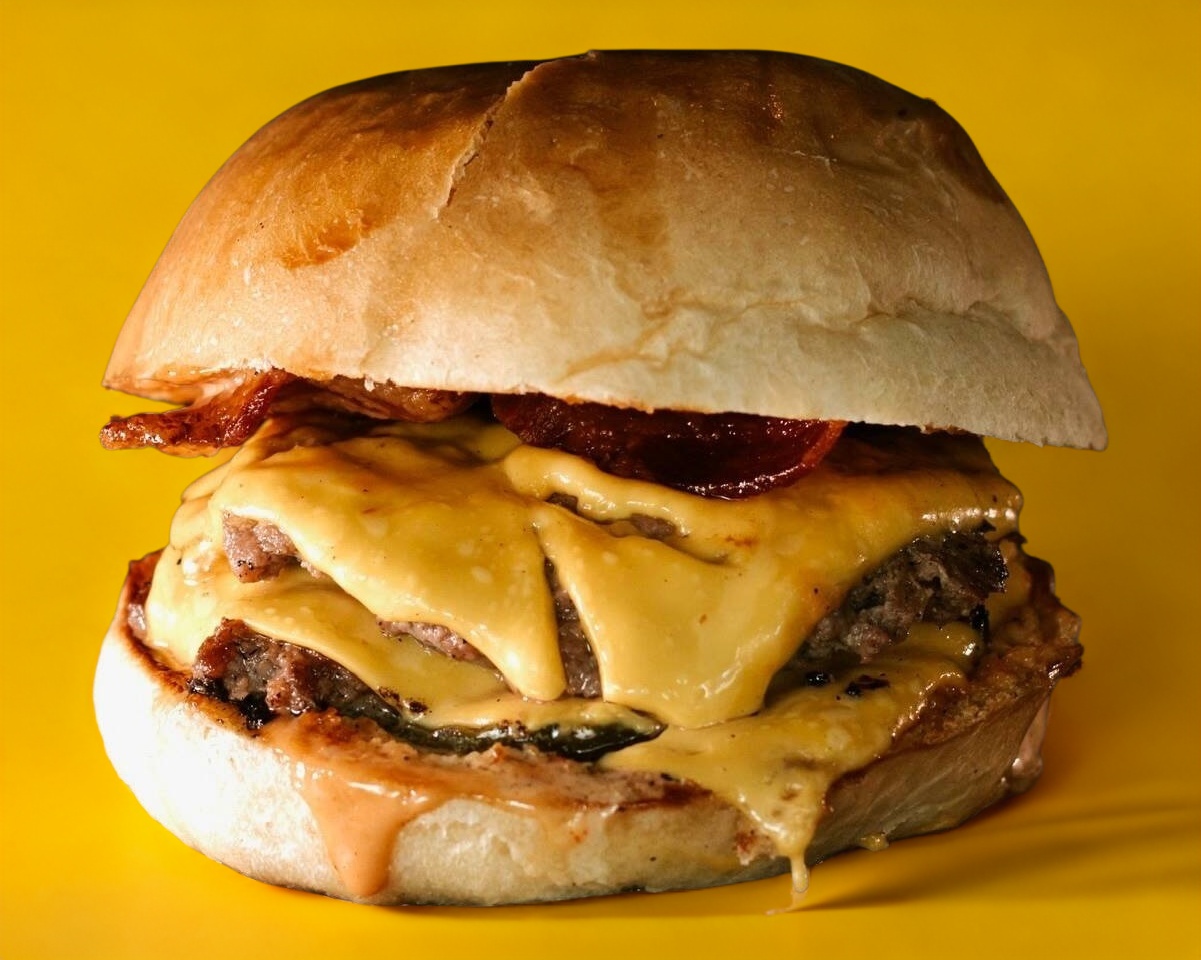 Hamburguesa en pan brioche de la casa con doble carne, queso americano, cebolla caramelizada, tocino, aderezo y pepinillos.