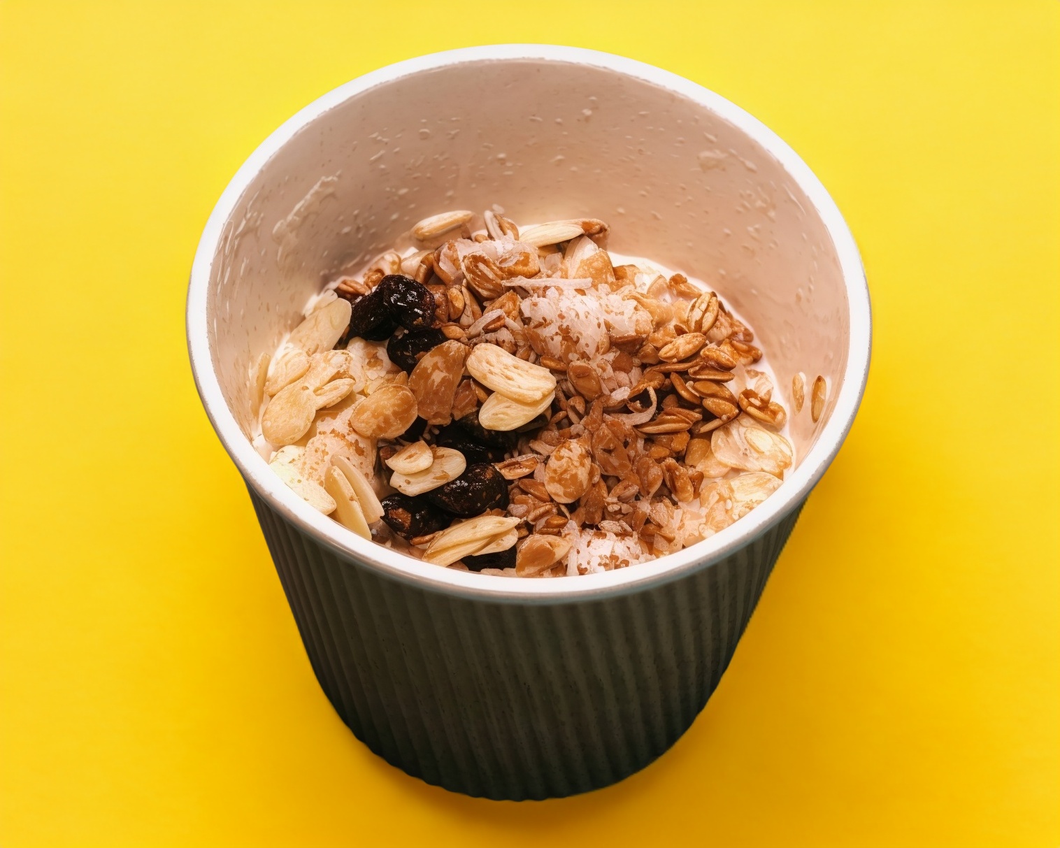 Avena con leche deslactosada, acompaña de almendra, arándanos, coco y granola