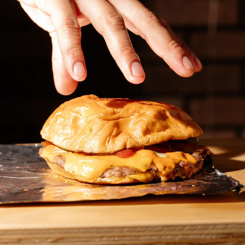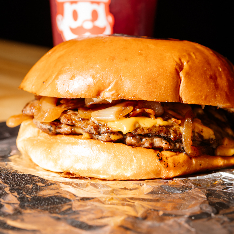 Pan brioche, doble carne de res premium, doble queso americano, doble tocino, cebolla asada, pepinillos, ketchup, trilogia de aderezos