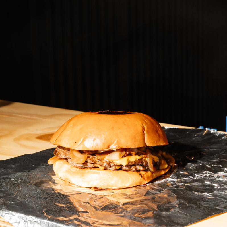 PAN BRIOCHE, CARNE DE RES PREMIUM, DOBLE QUESO AMERICANO,CEBOLLA ASADA, TOCINO, PEPINILLOS, TRIOLOGIA DE ADEREZOS