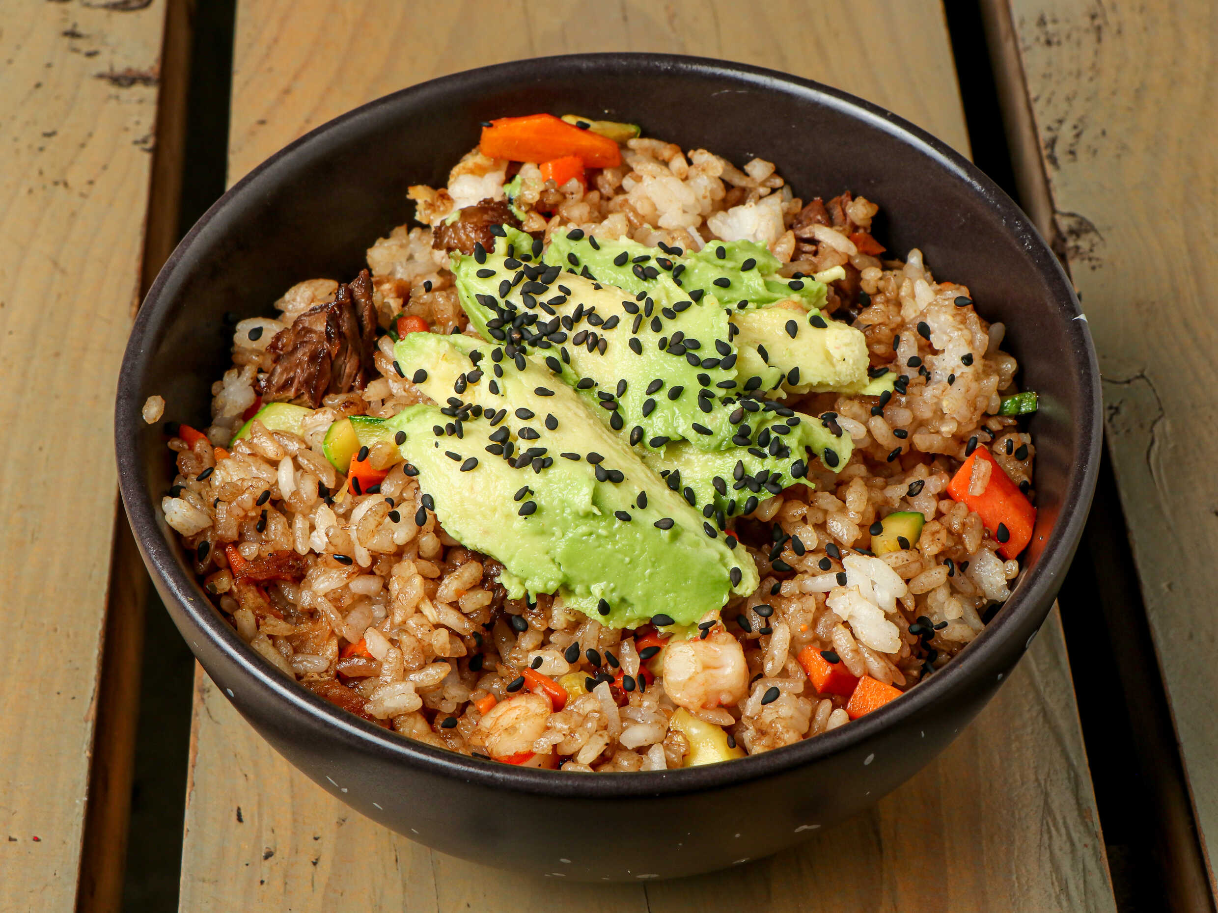 Arroz frito asiático, con toque distintivo de Nohara, calabaza, zanahoria y cebolla.
