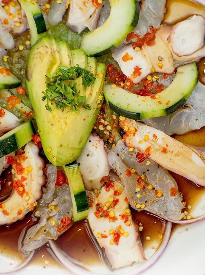 Tiritas de Pulpo, Camaron cocido, camaron seco, pescado blanco y almejas, con un toque de ajo y chipotle.