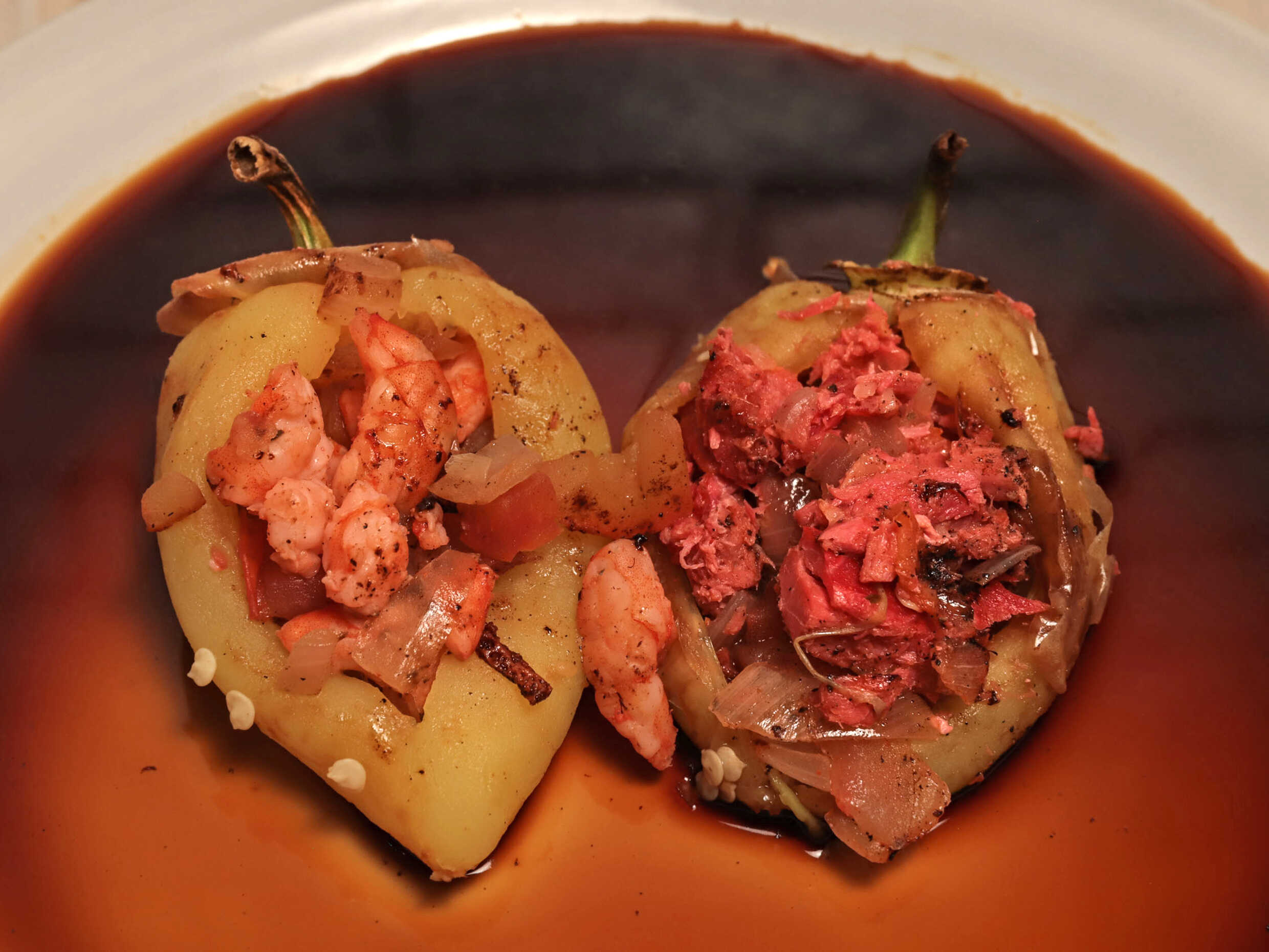 Taco de chile relleno de camarón.