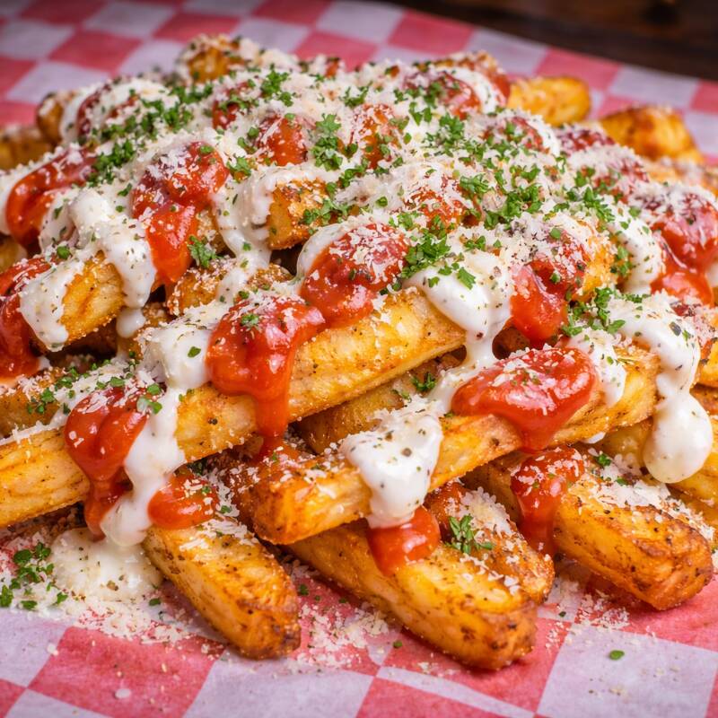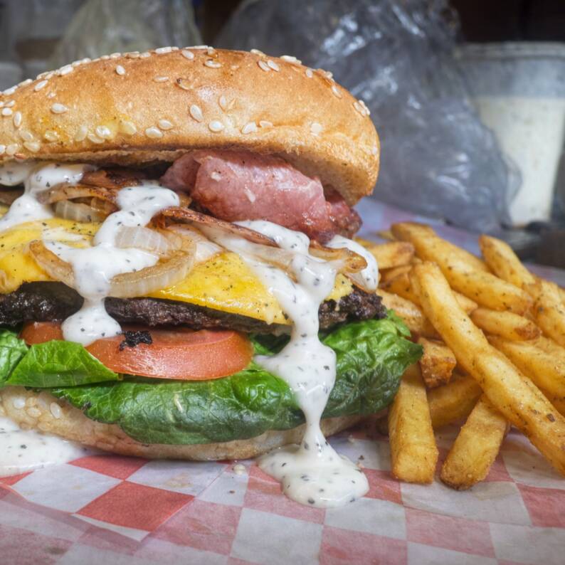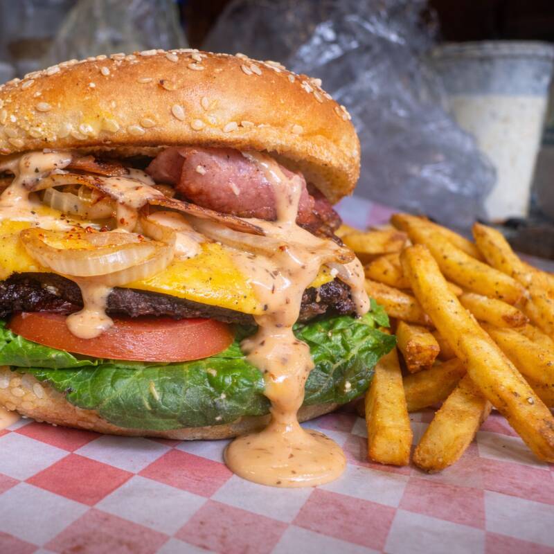 Disfruta 2 hamburguesas con carne de sirloin, queso derretido, tocino, lechuga, tomate y aderezo especial, acompañadas de papas sazonadas para compartir. Perfecto para disfrutar entre dos.