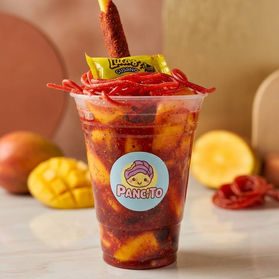 Mango con gomitas, skwinkles en una mezcla de chamoy y chile