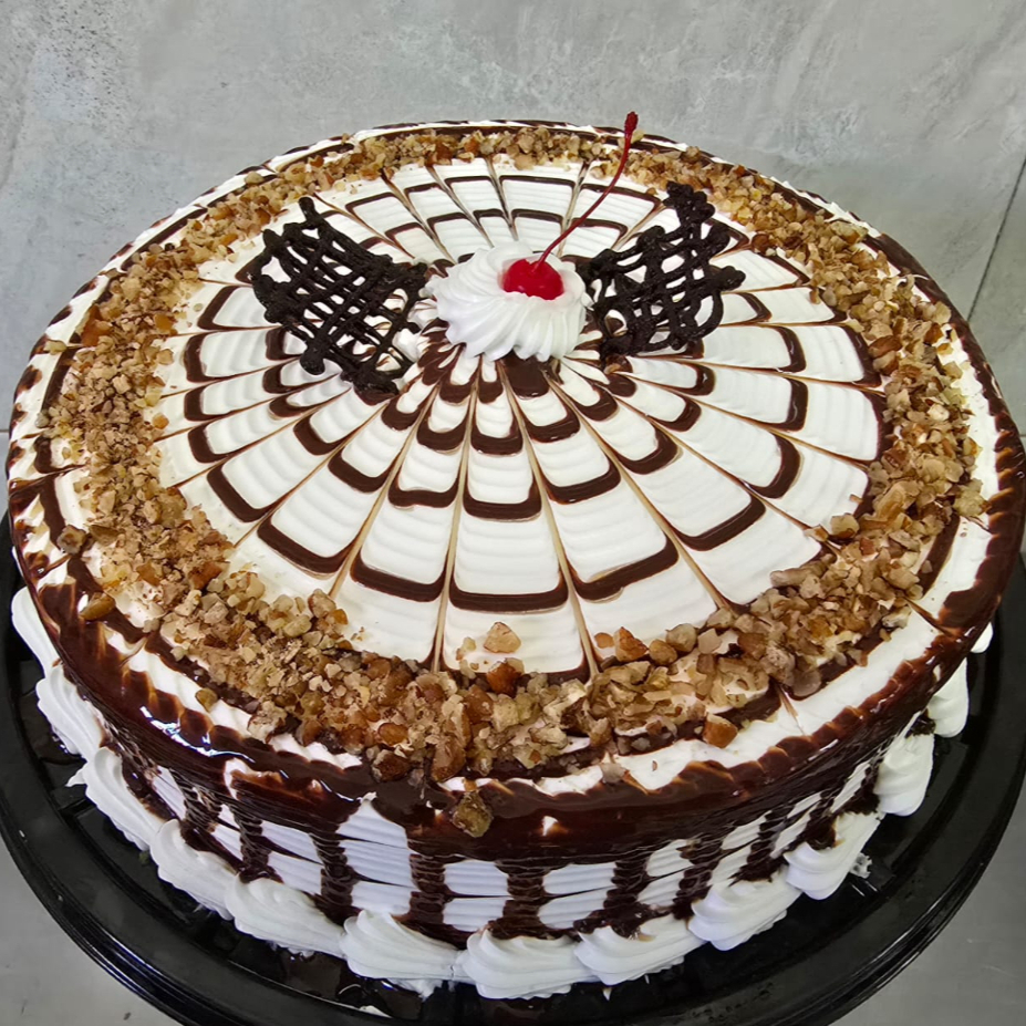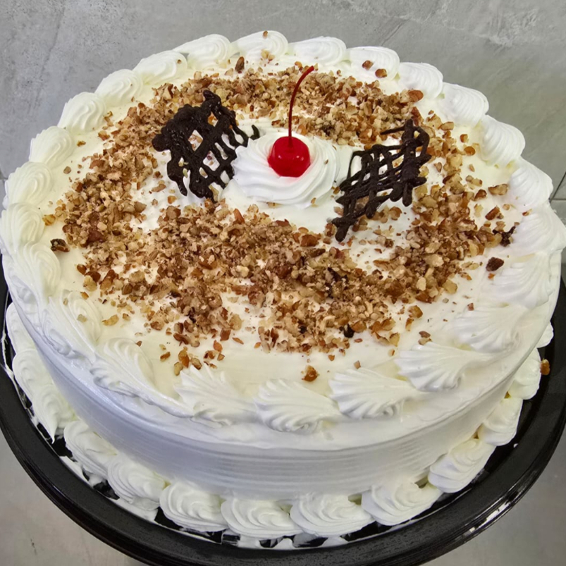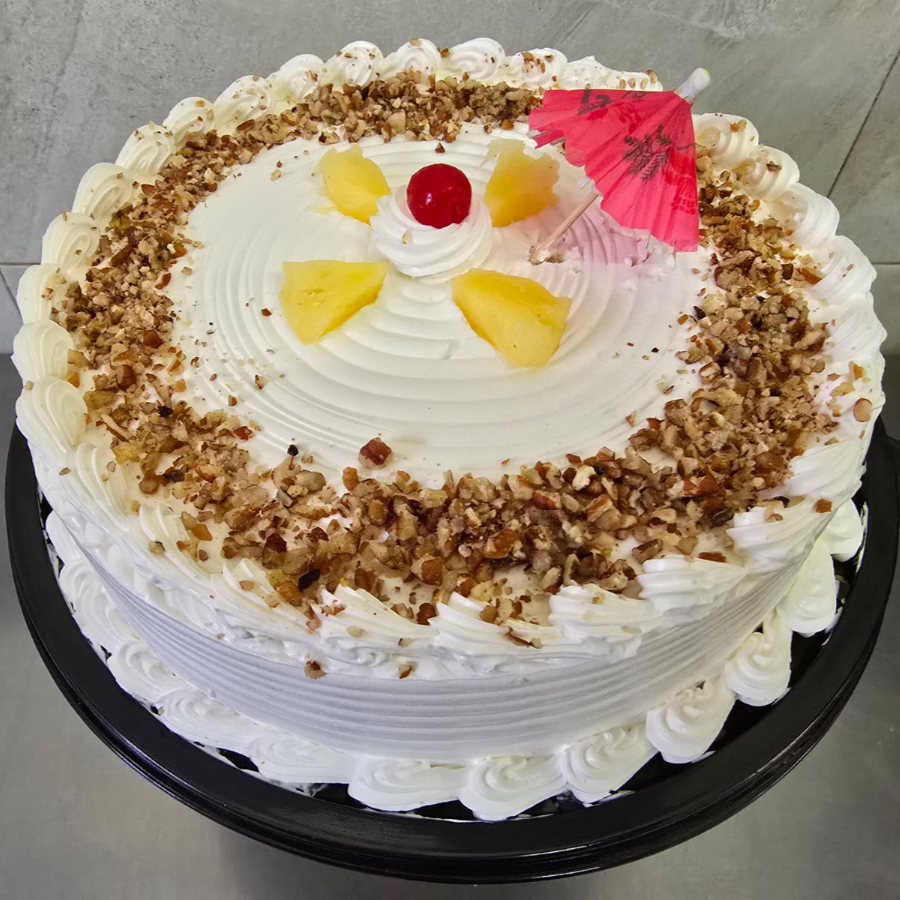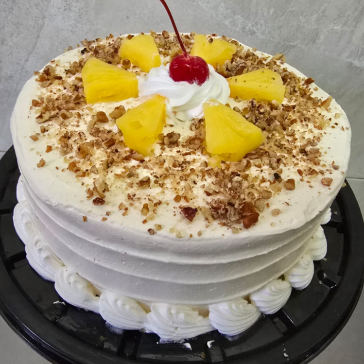El pan va humectado con jugo de piña,lleva relleno de piña y nuez y va con betún de limón
