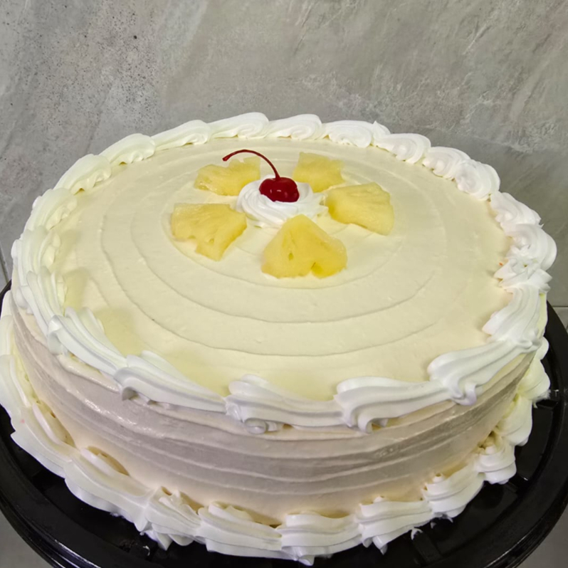 Pan humectado con jugo de piña relleno de mermelada de piña y va con betún de limón