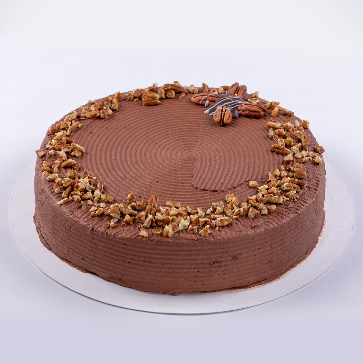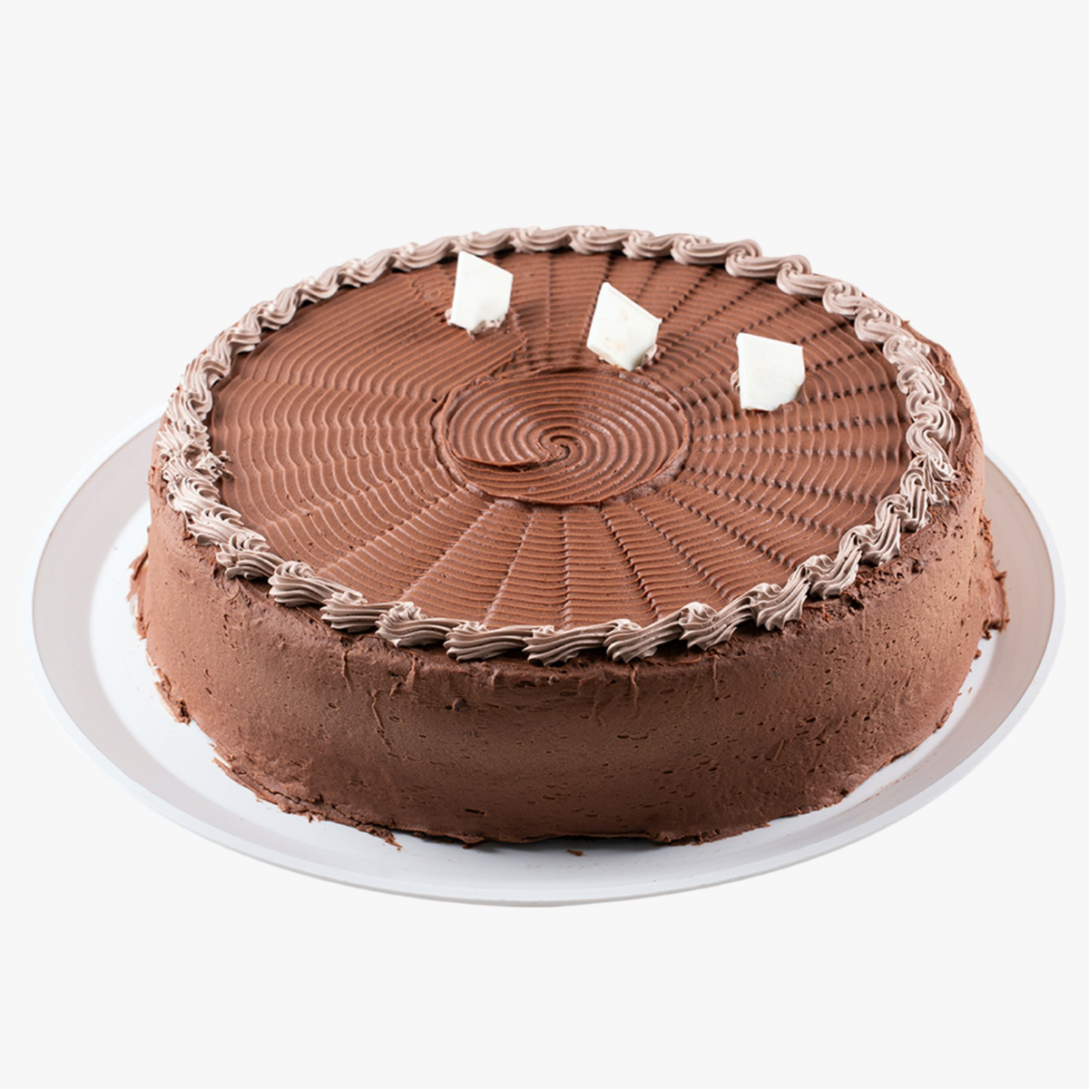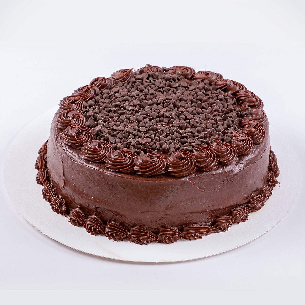 Pastel de chocolate, relleno de chocolate, cubierto con betún de chocolate con chispas de chocolate.