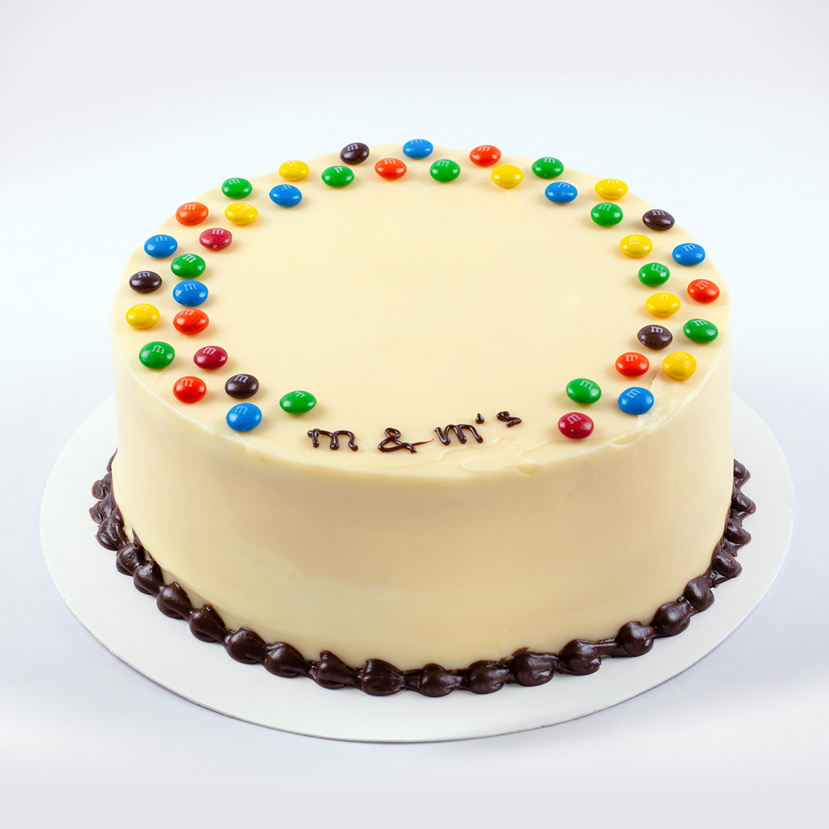 Pastel de vainilla relleno de betún de queso crema cubierto con chocolate blanco y m&m’s.