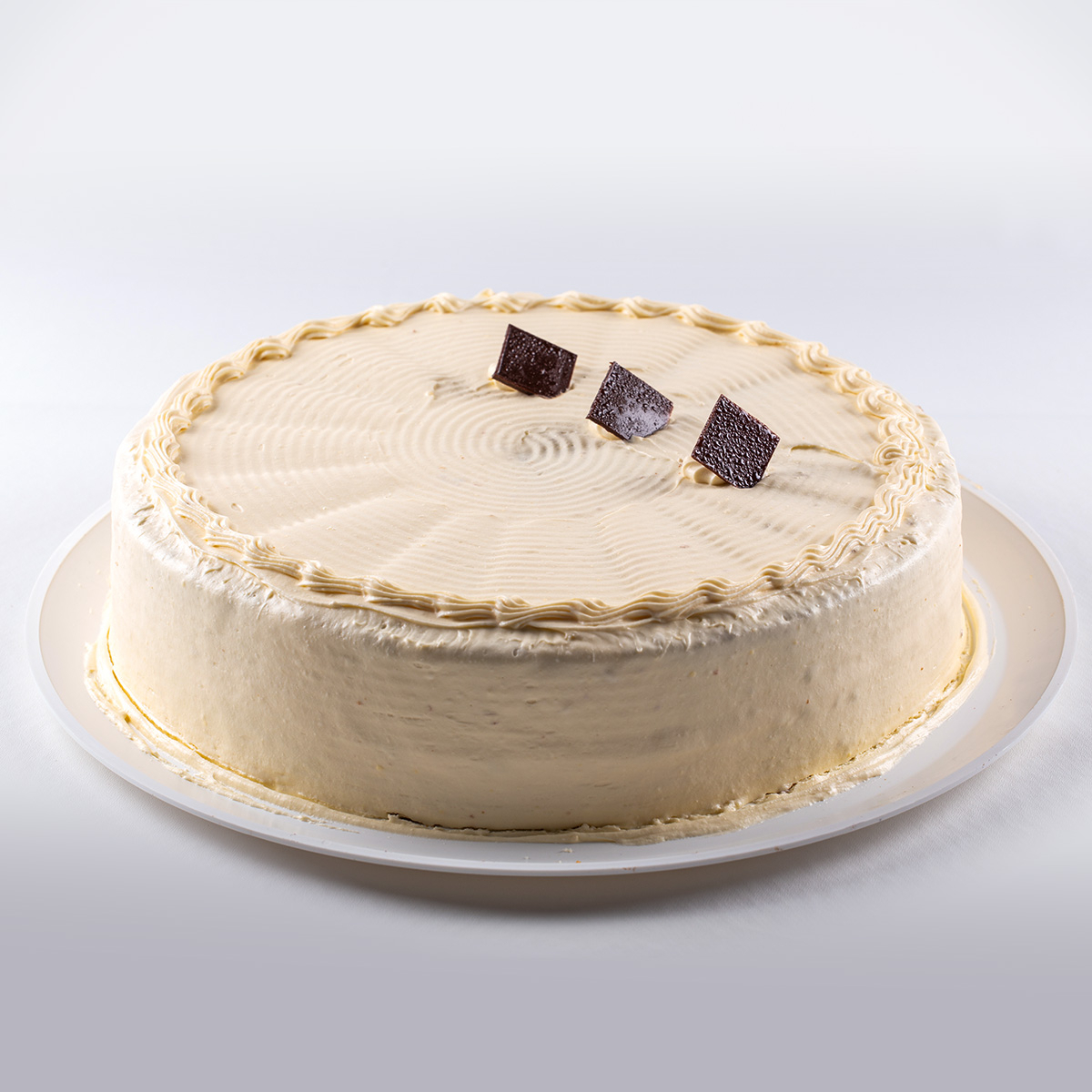 Pastel tres leches vainilla relleno con trocitos de durazno, cubierto con betún de crema, decorado con mermelada de durazno y nuez. El favorito de todos los pasteles tres leches.