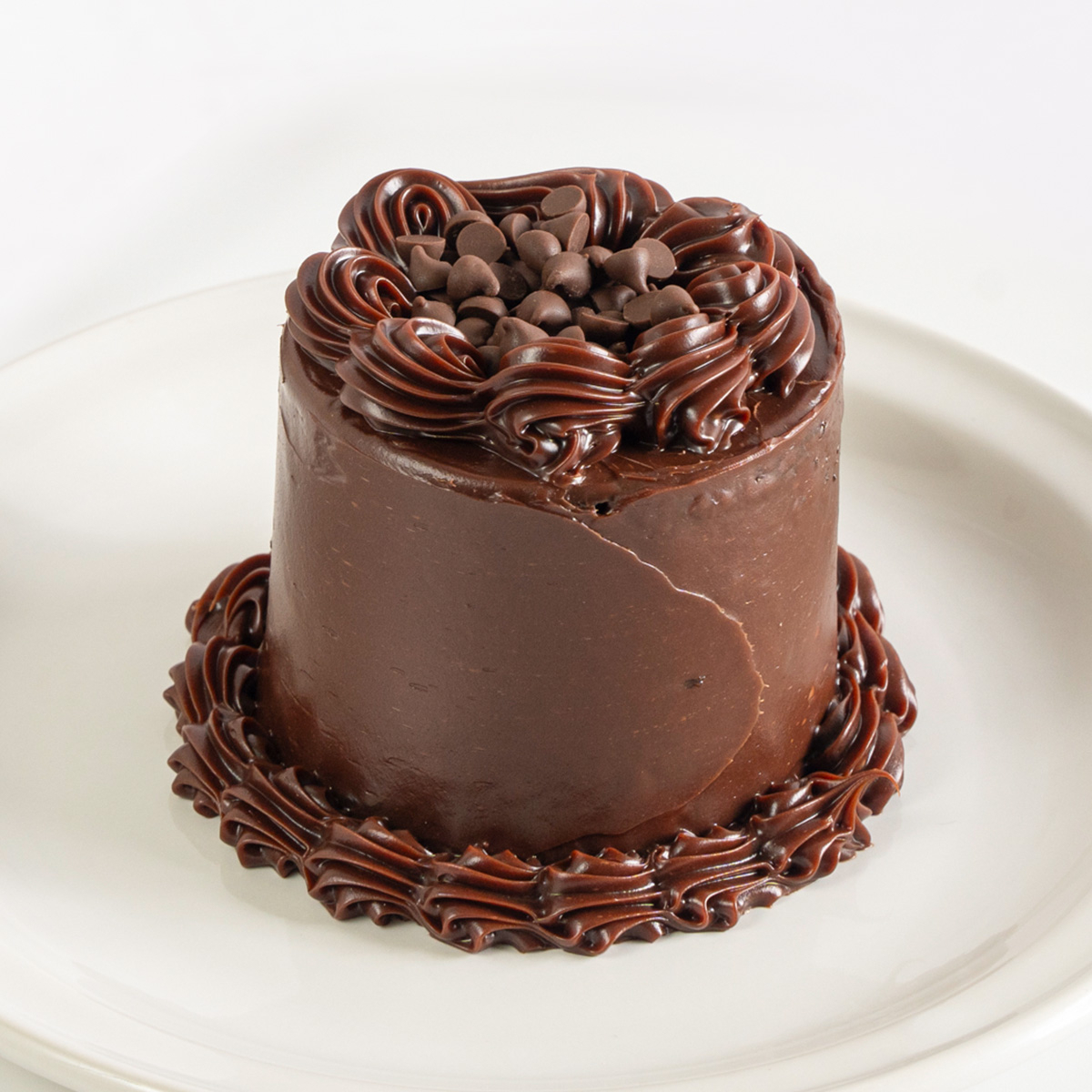 Delicioso pastelito individual cubierto de chocolate obscuro tradicional con un detalle de corazón de temporada.