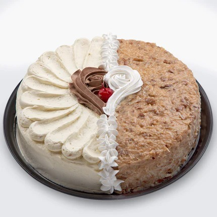 ¡El equilibrio perfecto! Mitad de naranja y mitad pastel alemán con su clásico betún de coco y nuez.