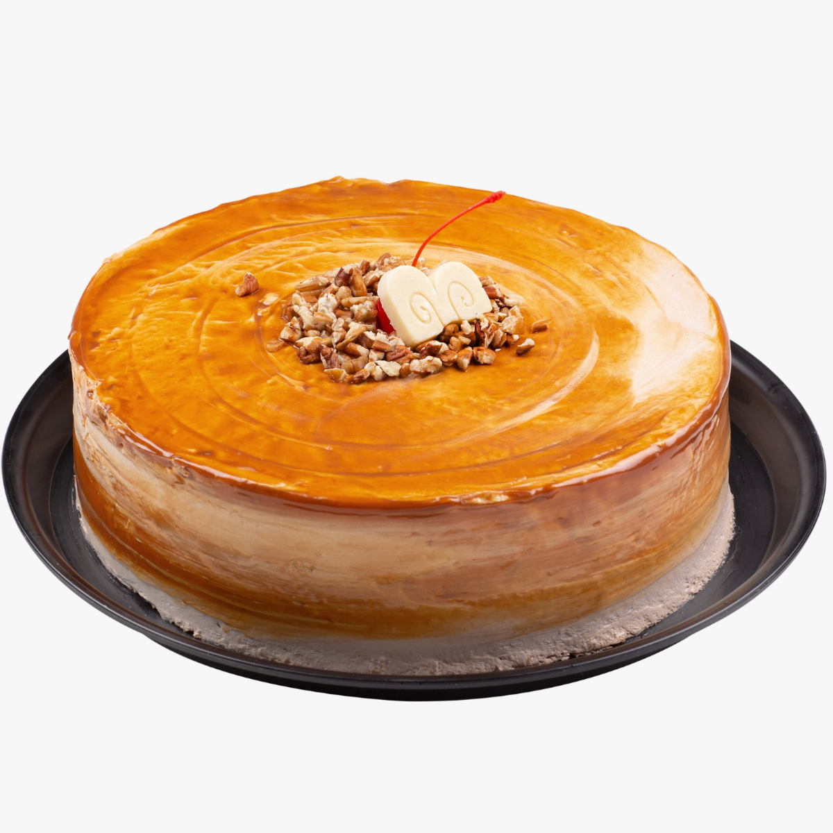 Pastel tres leches vainilla relleno con trocitos de durazno, cubierto con betún de crema, decorado con mermelada de durazno y nuez. El favorito de todos los pasteles tres leches.