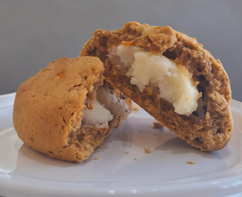 Deliciosa galleta de zanahoria con un suave y cremoso relleno de cheesecake, perfecta para disfrutar en cualquier momento del día.