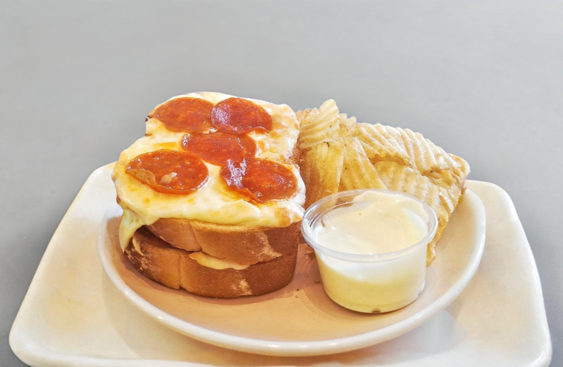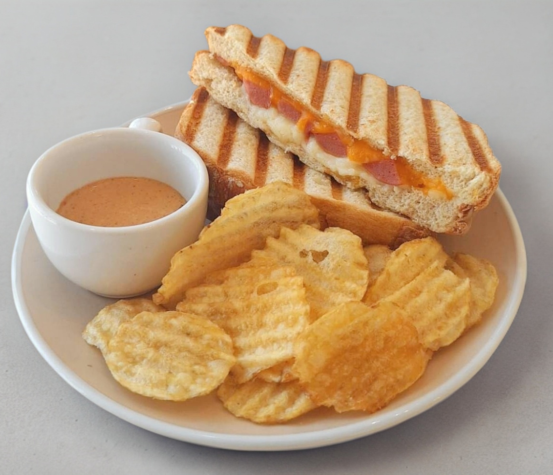 Sandwich tostado a la parrilla una capa de salchicha de pavo envuelta en una doble capa de queso fundido (Cheddar y Mozzarella). Combinacion perfecta de txturas y sabores. Incluye papas crujientes acompañado de un aderezo a escoger.