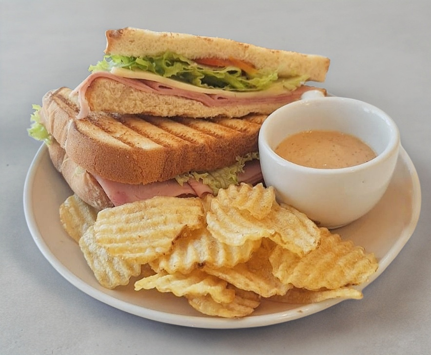 Generosas rebanadas de jamón de pavo, una capa de queso, fresca lechuga y jugosas rebanadas de tomate. Acompañado de papas crujientes y tu aderezo favorito para complementar.