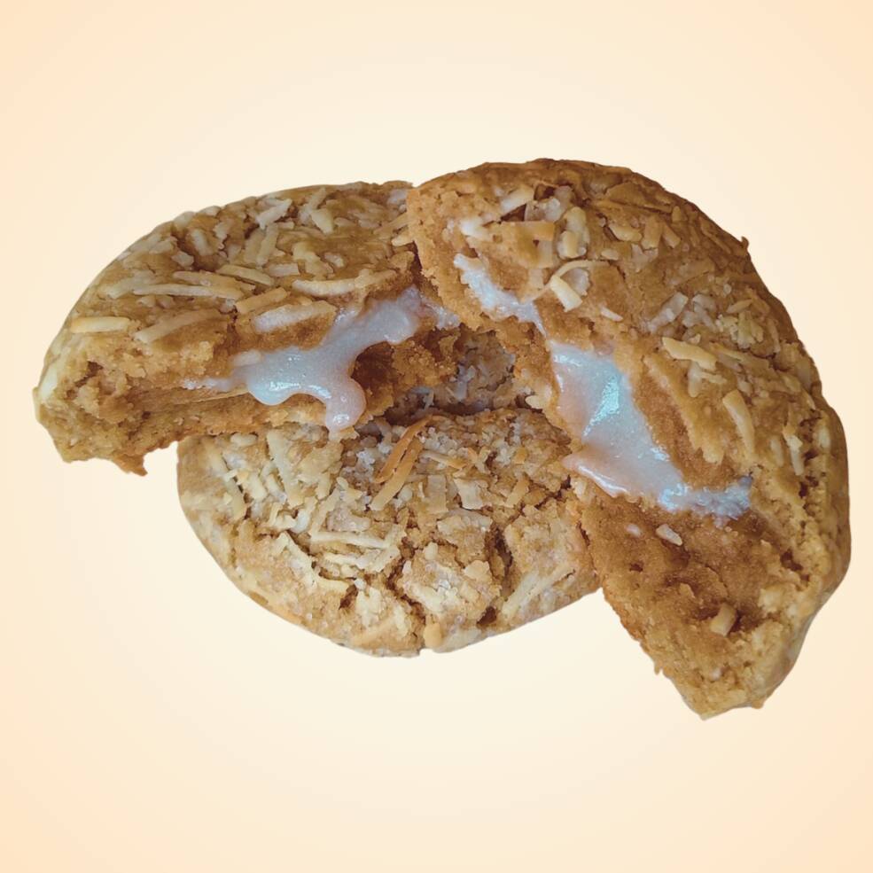 Galleta de coco rellena de ganache de chocolate blanco. Cubierta con coco rallado por doquier.