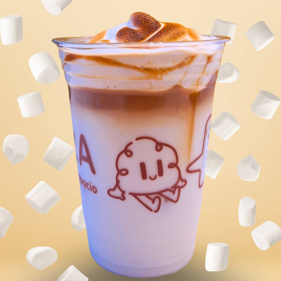 Latte sabor malvavisco coronado con crema de malvavisco flameado, el favorito de Pau. (Versión caliente es con malvaviscos)