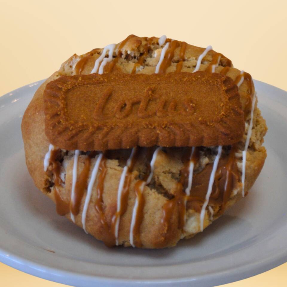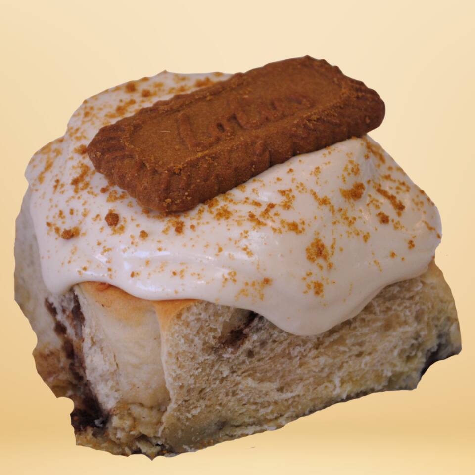 Nuestro clásico rol de canela, bañado en una lluvia de galleta Lotus y glaseado hecho con cema Lotus.