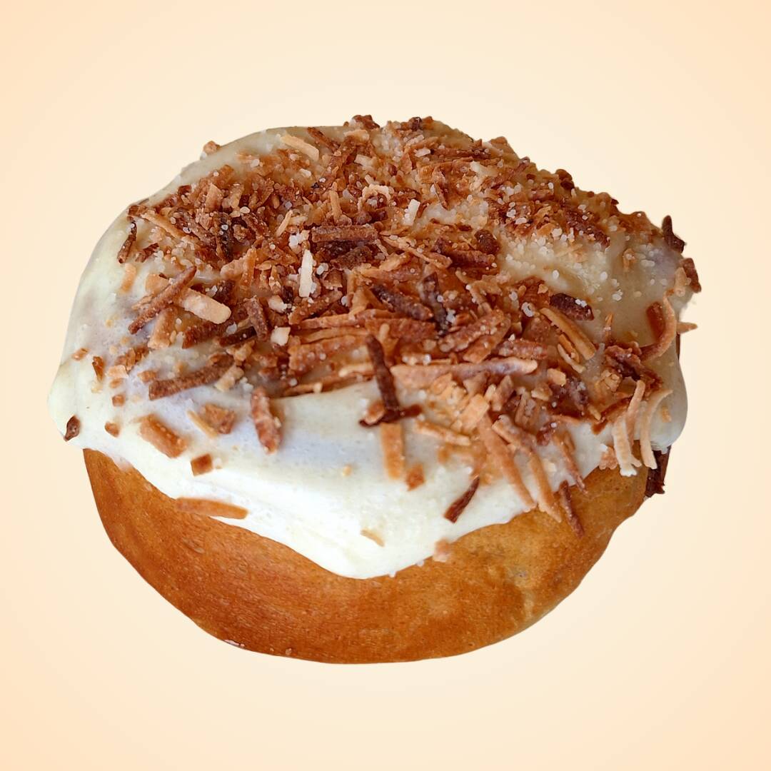 Rol sabor coco con glaseado de coco y ralladura tostada doradita.