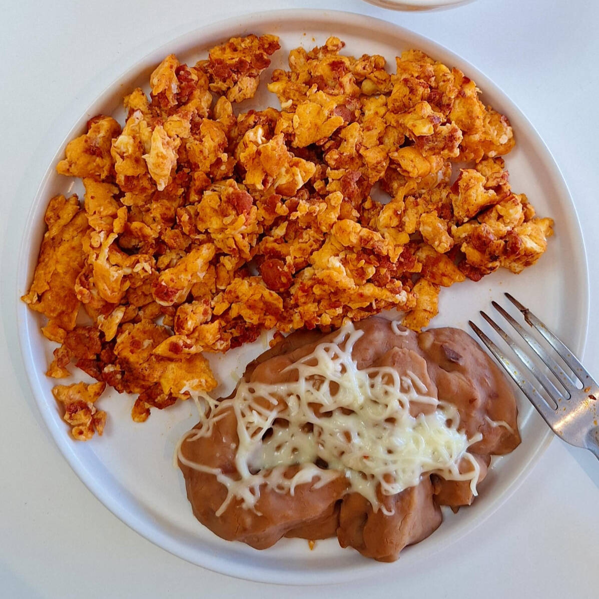 2 Huevos estrellados o revueltos acompañados de frijoles refritos con queso.