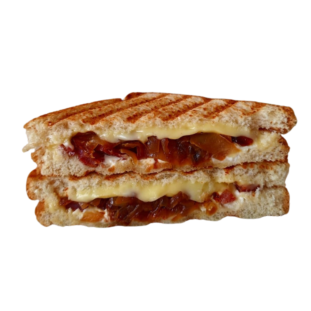 Tocino ahumado, cebolla caramelizada, queso menonita y queso crema.