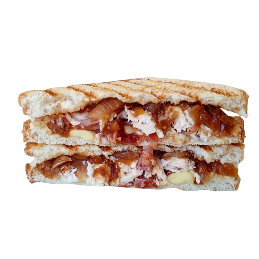 Pollo deshebrado, tocino ahumado, cebolla caramelizada y queso menonita.
