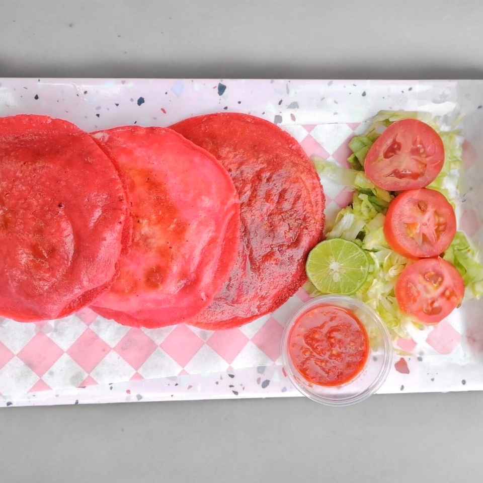 3 Gordita de maíz color rosa cerdito fritas servidas con lechuga, tomate y salsa de árbol.
