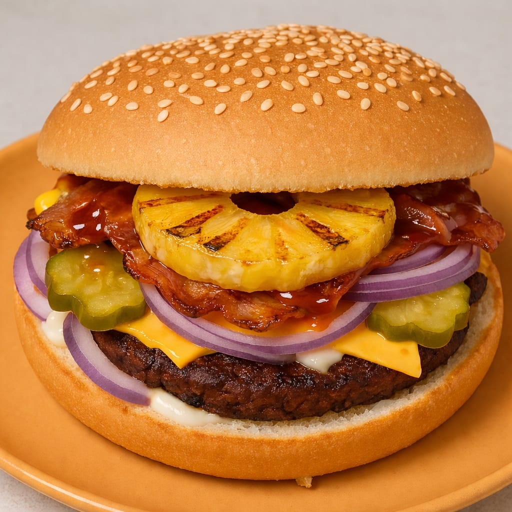 Deliciosa carne de sirlon de 150 gr. con piña, tocino y jamón, queso gratinado, queso americano, pan artesanal, verdura y aderezo de la casa.