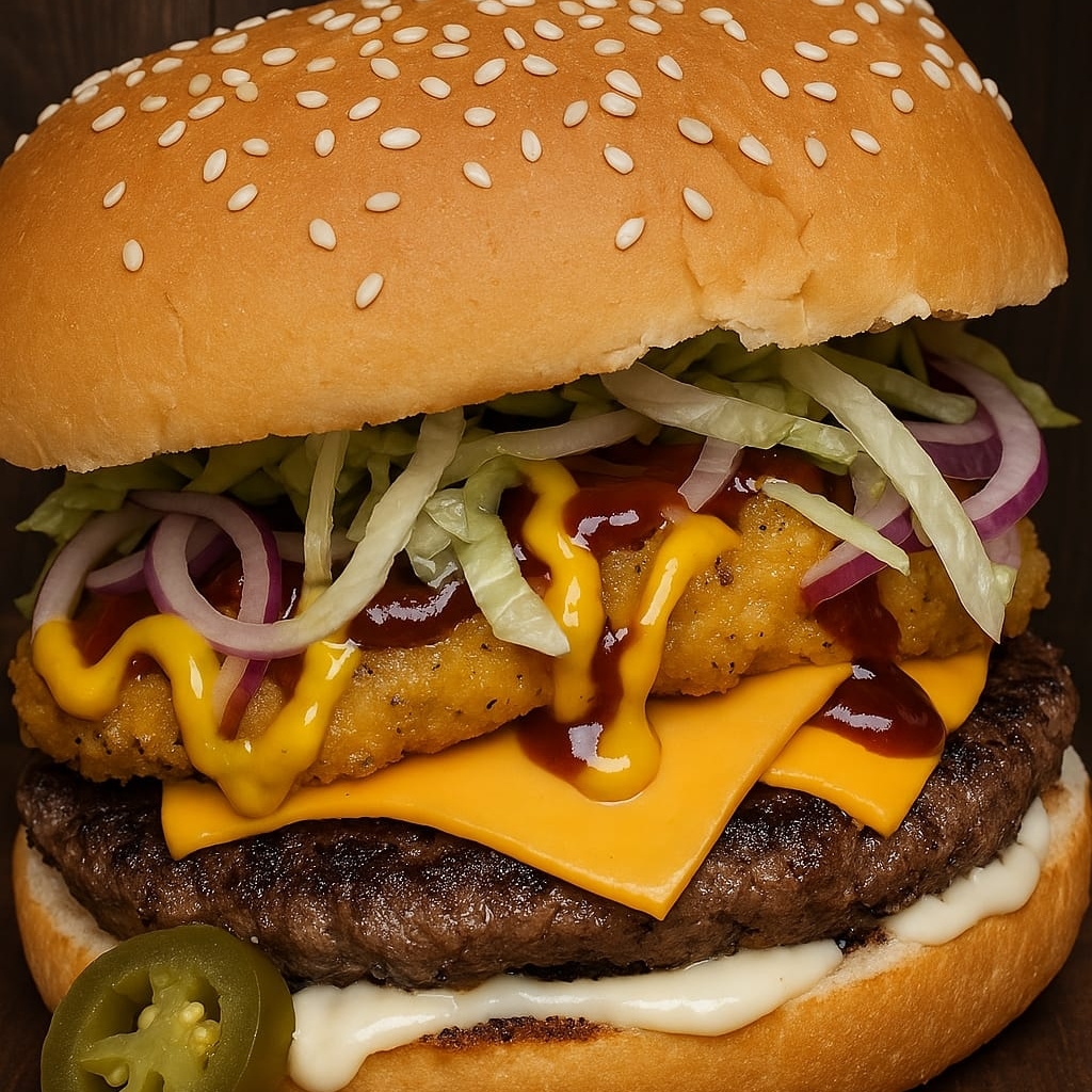 1 carne de pollo con salsa buffalo 1 carne de res , doble queso, jamon, tocino,verdura y aderezo de la casa
