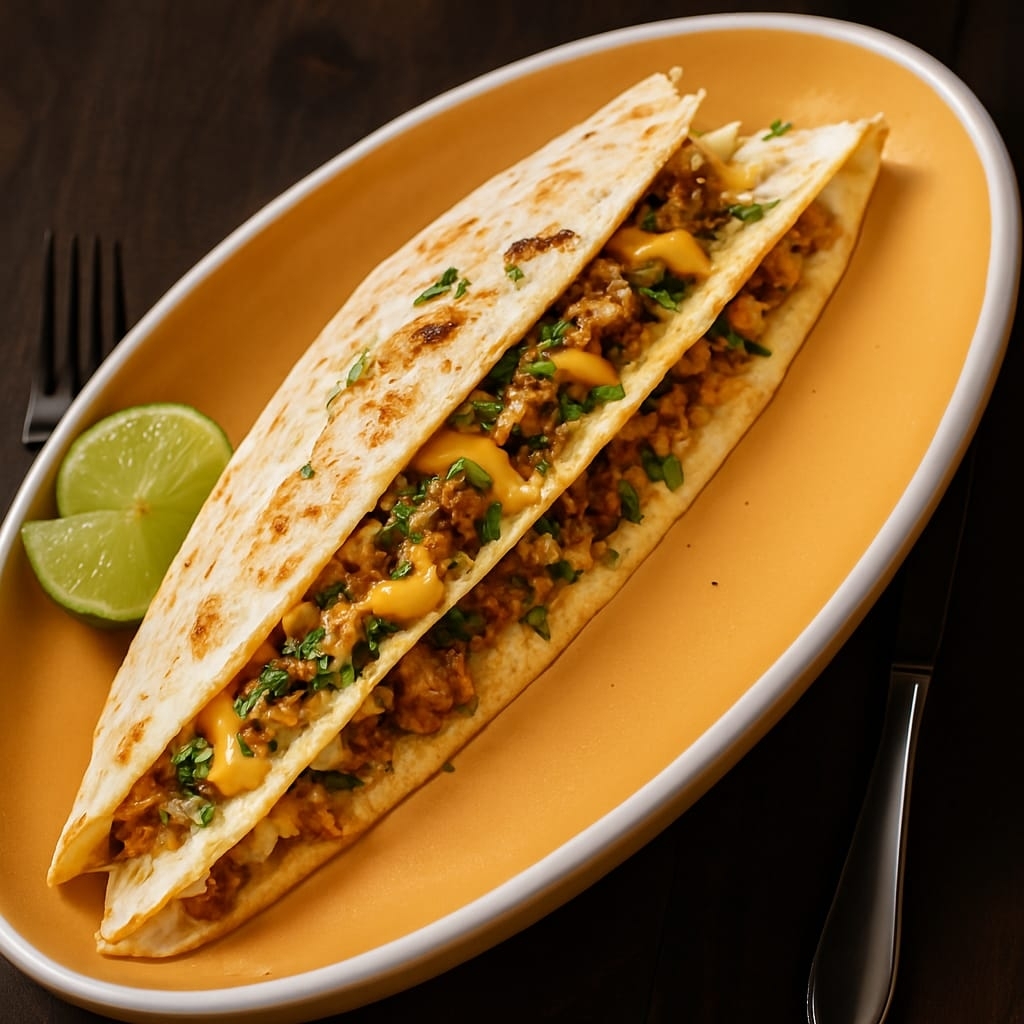 carne de pastor con queso gratinado ,cebolla y cilantro acompañada de salsa verde