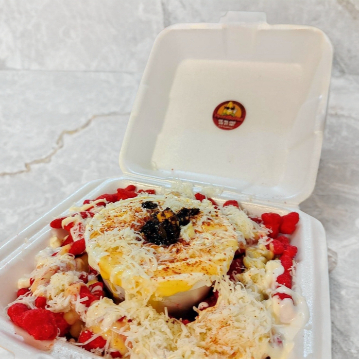 Papita natural, con cueritos, salsas negras, limón, salsa botanera y 2 variedades de gomitas