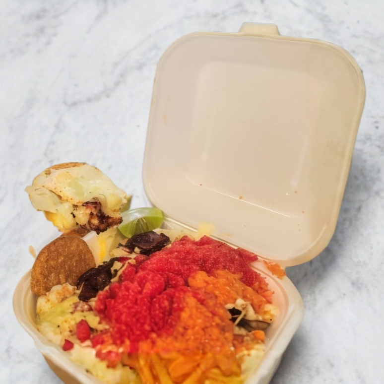 Charola con 1/4 L de elote preparado al centro, rodeado de tostitos, elote desgranado, Maruchan a elegir, bañado con queso amarillo, mantequilla, mayonesa, crema, queso rallado, queso en polvo y chilito en polvo