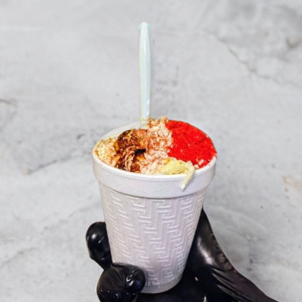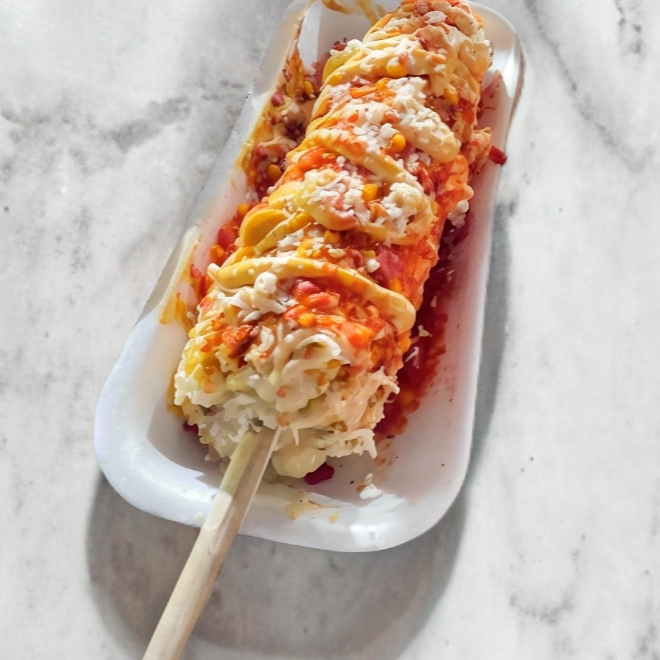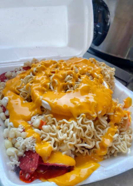 Maruchan preparada con tostitos y elote desgranado, queso amarillo, mantequilla, mayonesa, crema, queso rallado, queso en polvo y chilito en polvo.