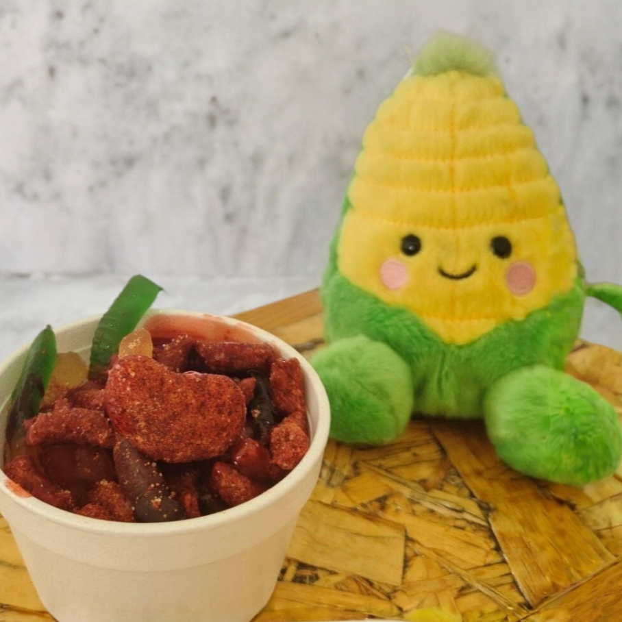 Gomitas de azúcar y chilito, bañadas en chamoy, limón y miguelito