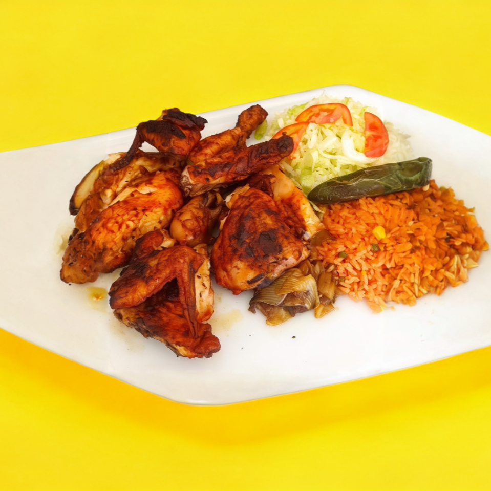 Medio pollo rostizado, acompañado de arroz con verdura, salsa, tortillas hechas a mano tres piezas, cebollita caramelizada y chile toreado.