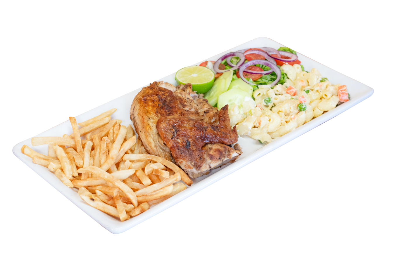 1/4 Pollo de pollo asado, 1/4 sopa de codito, papas a la francesa y verdura (incluye tortillas y salsa).