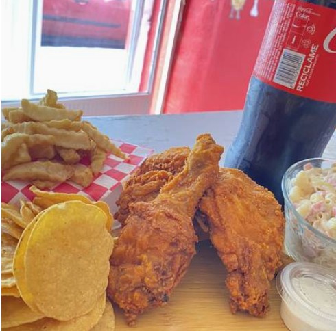 Un 1/2 kg de pollo empanizado, 1/2 de sopa fría, orden de papas a la francesa, refresco de 1.5 L.