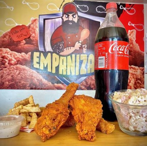 1 kg De pollo empanizado, 1/2 de sopa fría, orden de papas a la francesa, refresco de 1.5 L.