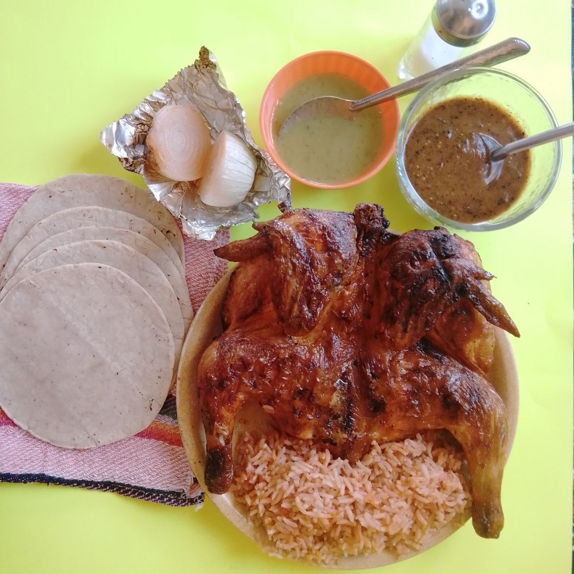 Asado al carbón, incluye arroz, cebolla asada, tortillas y salsa.