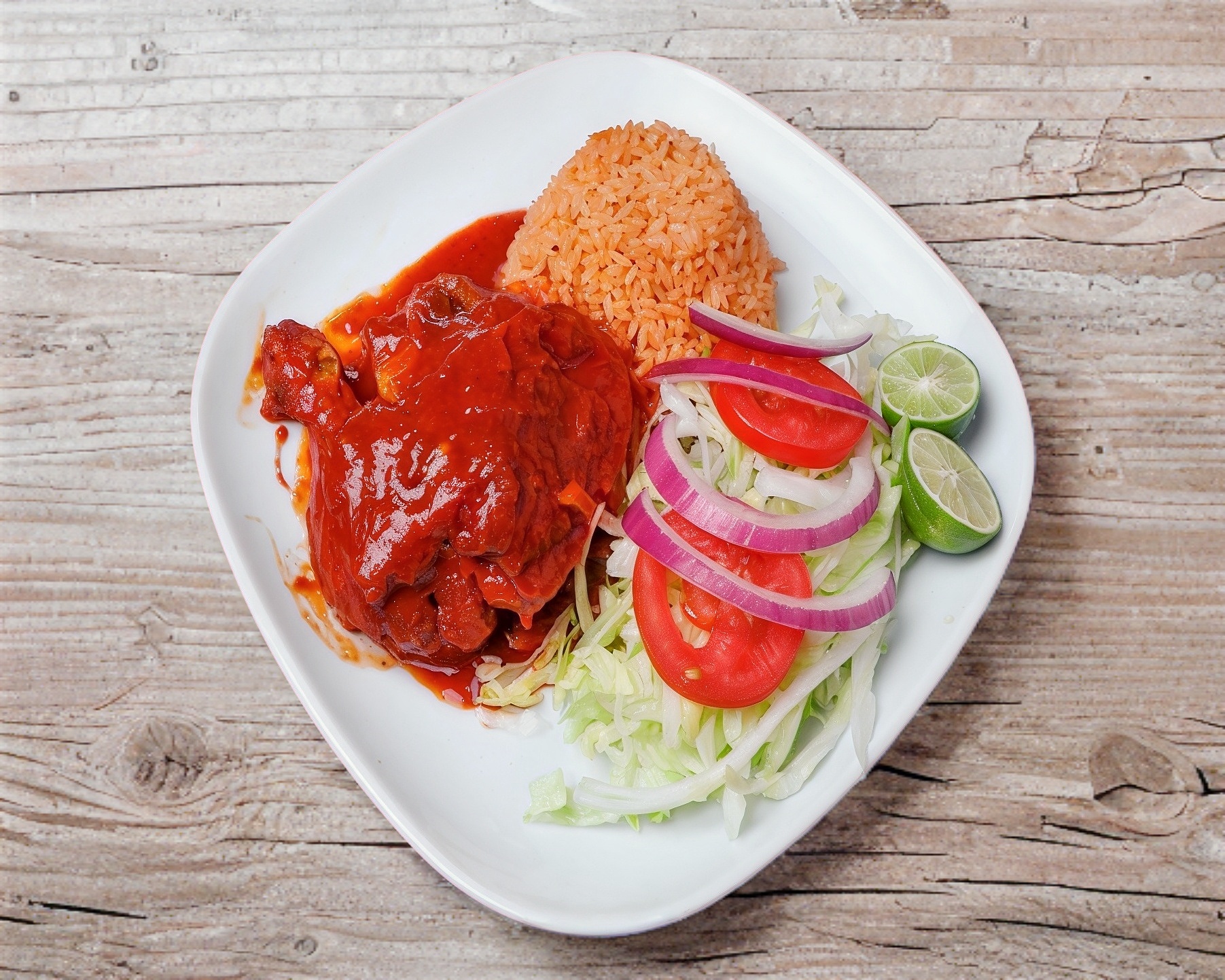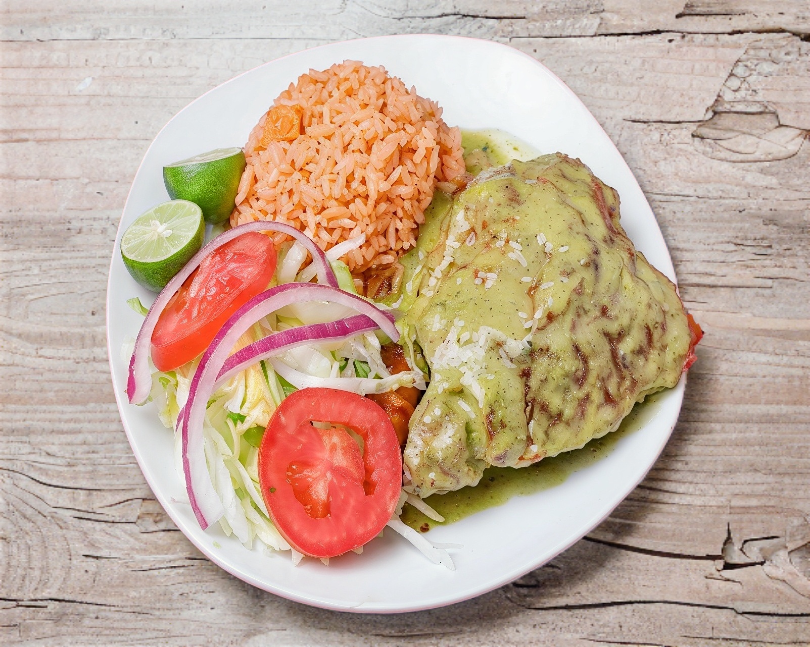 4 Enchiladas rojas o verdes de pollo y/o de queso; con arroz, ensalada de lechuga y salsa.