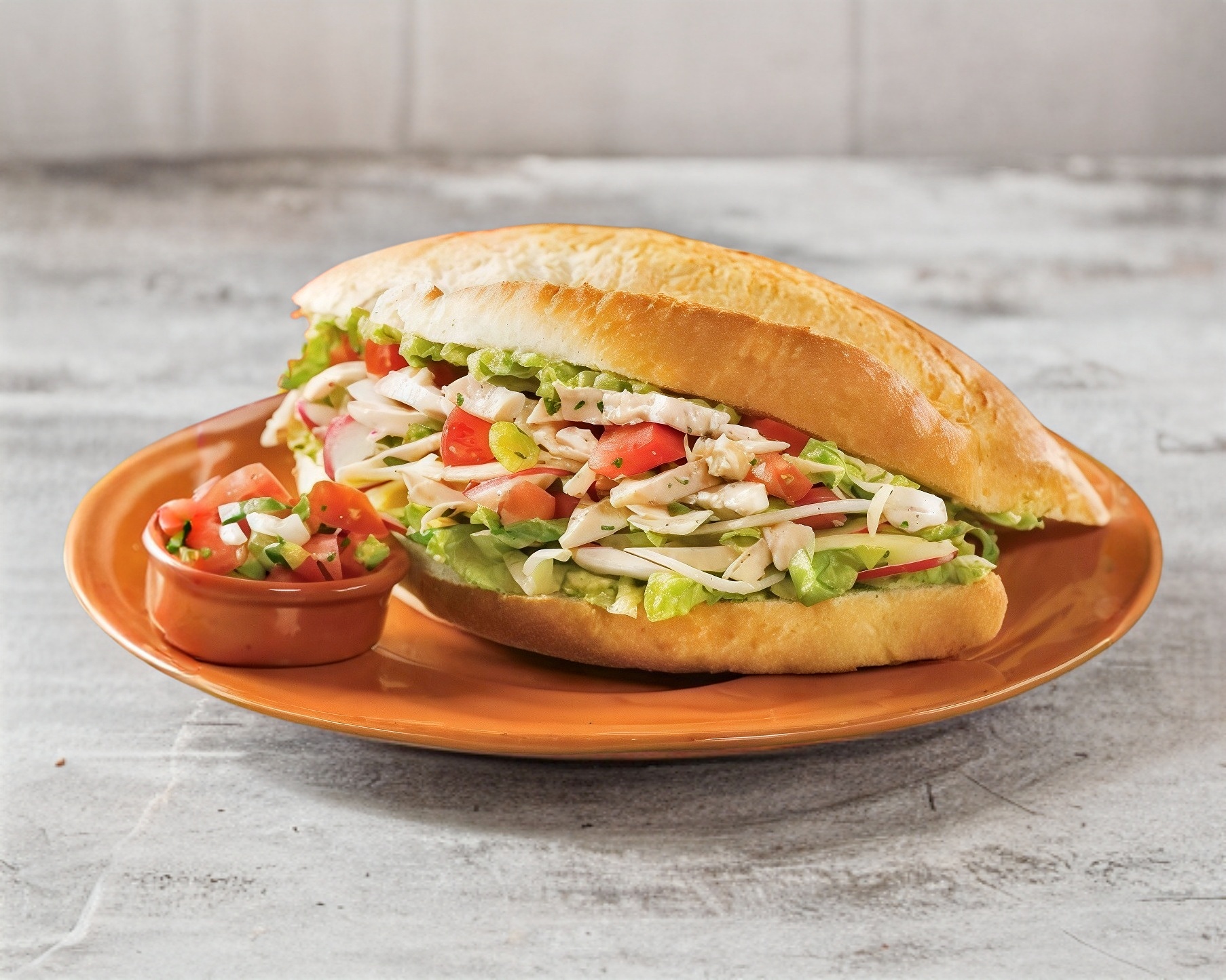 Torta de pollo rostizado con jamón, queso, aguacate, jitomate, cebolla y lechuga.