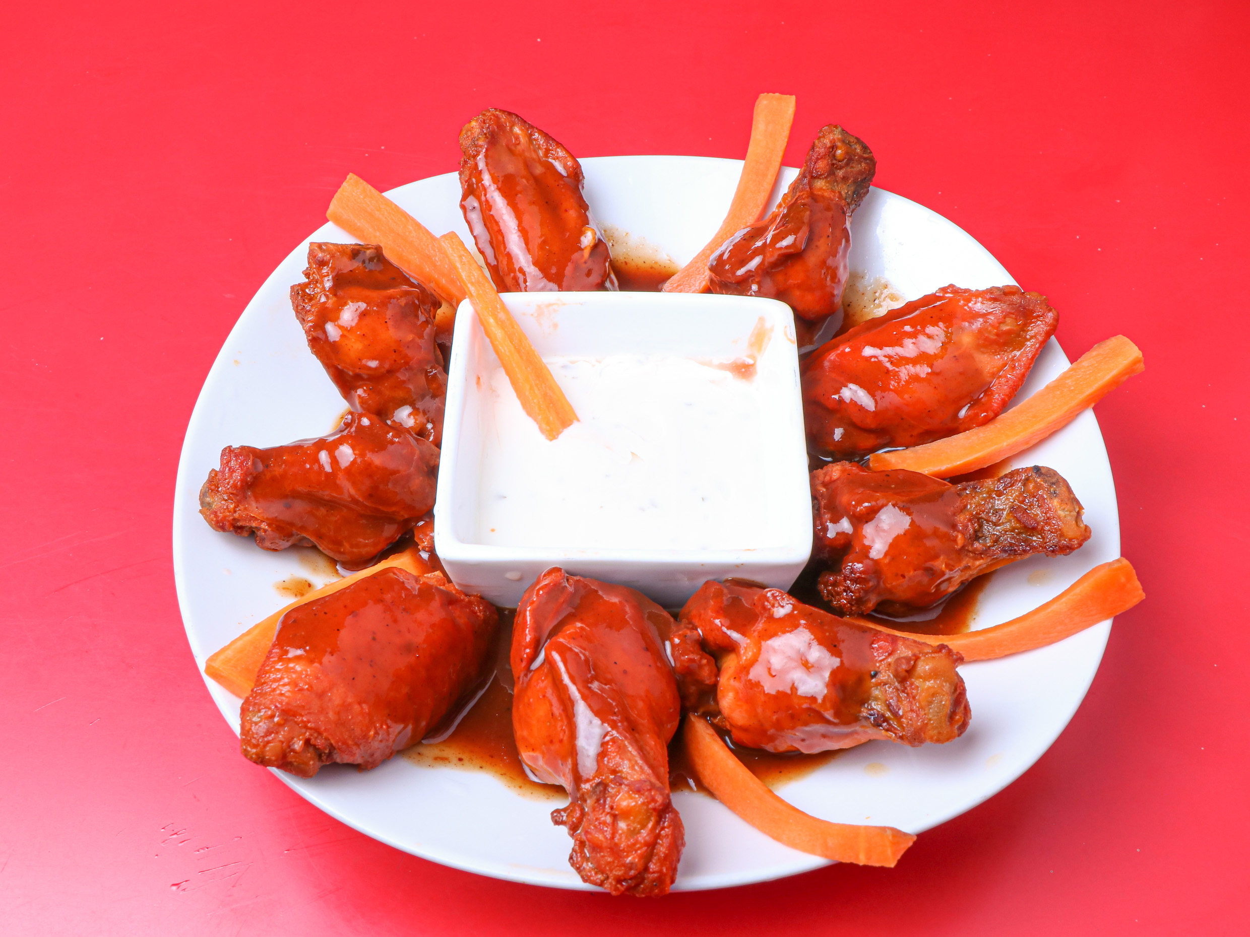 Orden con 1/4 kg alitas bañadas en salsa buffalo y acompañadas de aderezo ranch y trocitos de zanahoria.