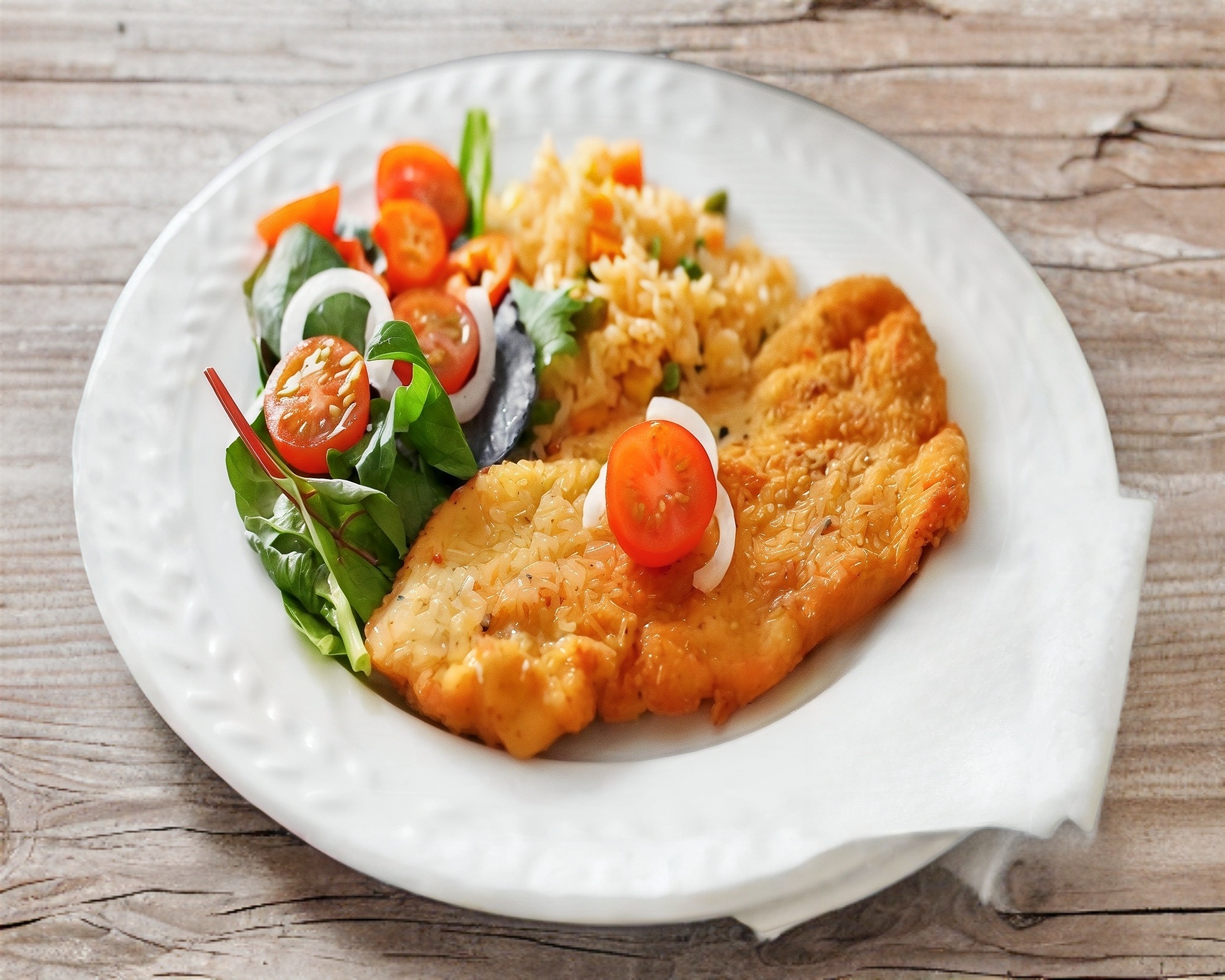 Milanesa de pechuga de pollo; acompañada de arroz o espagueti, papas a la francesa, salsa y tortillas.